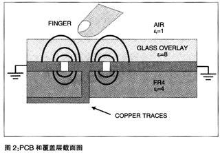 在PCB上通過(guò)一個(gè)過(guò)孔將感應(yīng)器焊盤(pán)連接到電路板底層的一條走線(xiàn)上,如圖2所示。當(dāng)電場(chǎng)嘗試著尋找回地的最短路徑時(shí),介電常數(shù)εr會(huì)影響到材料中電場(chǎng)能量的緊密程度。標(biāo)準(zhǔn)窗口玻璃的介電常數(shù)大約為8,而PCB的FR4材料介電常數(shù)大約為4。通常使用在白色家電商品上的高硬度玻璃的介電常數(shù)則約為5。在這個(gè)設(shè)計(jì)實(shí)例中,使用的是標(biāo)準(zhǔn)窗戶(hù)玻璃。要注意的是,玻璃板是用3M公司的不導(dǎo)電黏合膠帶468-MP安裝在電路板上的。