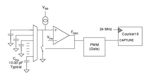 該比較器的輸出被作為一個(gè)脈沖寬度調(diào)制器(PWM)電路的時(shí)鐘輸入信號(hào),它負(fù)責(zé)選通一個(gè)頻率為24兆赫茲的16位計(jì)數(shù)器。手指接觸傳感器時(shí)會(huì)增加電容,從而增加計(jì)數(shù)器的總值。這就是一個(gè)手指如何被感覺(jué)到方式。這個(gè)系統(tǒng)的典型波形如圖4所示