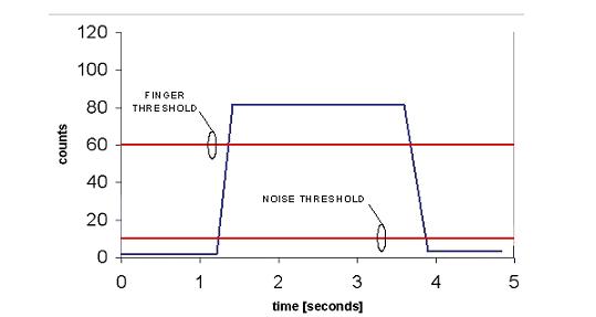 同時(shí)還給出了門(mén)限值。噪聲門(mén)限被設(shè)定的計(jì)數(shù)值為10,而手指門(mén)限設(shè)定的計(jì)數(shù)值則為60。實(shí)際上,在實(shí)際計(jì)數(shù)數(shù)據(jù)中始終存在噪聲分量,圖中并未顯示,以便能清晰地顯示門(mén)限水平。