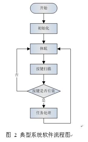 圖2是一個具有休眠功能的典型系統(tǒng)軟件流程圖。系統(tǒng)初始化后進(jìn)入休眠模式,經(jīng)過一段時間的延時后喚醒掃描按鍵模塊,進(jìn)行按鍵掃描。如果有按鍵按下,軟件判斷是否有效。如果無效按鍵按下,那么系統(tǒng)繼續(xù)進(jìn)入休眠模式。如果軟件判斷按鍵有效,那么喚醒系統(tǒng),觸發(fā)任務(wù)處理進(jìn)程。當(dāng)處理完所有任務(wù)后,系統(tǒng)又重新進(jìn)入休眠狀態(tài)。這是個典型的具有休眠功能的系統(tǒng)工作流程圖,它的優(yōu)點就是此軟件流程簡單易懂、容易實現(xiàn),一般可以滿足大多數(shù)場合的應(yīng)用。但是,如果系統(tǒng)任務(wù)處理消耗了較多的CPU處理時間,那么為了達(dá)到目標(biāo)平均工作電流,就需要相應(yīng)增加休眠時間。同時降低了按鍵掃描的頻率,從而加長了系統(tǒng)喚醒的響應(yīng)時間。因此,此方法適合比較簡單的、系統(tǒng)任務(wù)不復(fù)雜的應(yīng)用。
