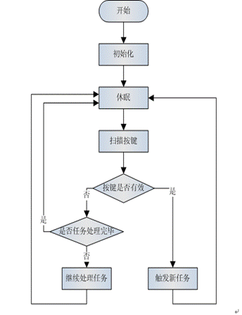 圖3是一個具有休眠功能的復(fù)雜系統(tǒng)軟件流程圖。此方法是將以上方法中的任務(wù)處理進(jìn)行分解,分為觸發(fā)新任務(wù),處理任務(wù)。目的就是減小在每個循環(huán)周期內(nèi)部執(zhí)行任務(wù)的所花費的CPU資源。與上一個方法的不同在于:系統(tǒng)喚醒掃描按鍵程序,當(dāng)判斷按鍵有效時,觸發(fā)新任務(wù),并不是將所有的任務(wù)處理完畢。在當(dāng)前的循環(huán)周期內(nèi),觸發(fā)的新任務(wù)可能沒有處理完畢,需要下一個或者更多個系統(tǒng)循環(huán)的時間才可以完成。當(dāng)判斷按鍵無效時,不是馬上進(jìn)入休眠模式,而是判斷是否有沒有處理完畢的任務(wù)。如果有則繼續(xù)處理;如果沒有則進(jìn)入休眠模式。此方法可以處理比較復(fù)雜的任務(wù),能滿足更多應(yīng)用領(lǐng)域的需求。