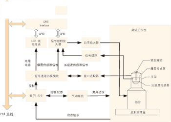 為保證汽車爆震傳感器測試系統(tǒng)的可靠性、高效性和可擴展性,在硬件組成上采用PXI系統(tǒng)實現(xiàn)對整個系統(tǒng)的控制,硬件資源與系統(tǒng)構(gòu)成如圖2所示,主要包括PXI控制器、PXI數(shù)字I/O板卡、振臺、LCR表、高阻表、信號鎖相放大器、信號通道切換模塊和氣動夾具系統(tǒng)等。