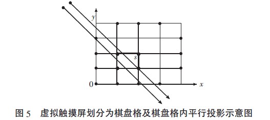 根據兩個攝像頭同時拍攝的圖像直線上的兩點,分別建立虛擬觸摸屏平面內的兩條直線方程,二者相交的點即為虛擬觸摸屏平面上的點。當某點屬于若干個棋盤格時,需進行特殊處理,計算出點坐標,檢查其是否在該棋盤格內,若是,則得出點坐標;否則,保留直線方程,選擇一個離棋盤格中心點距離最近的點作為點坐標。直線方程y=k·x+b (2)其中,k 表示斜率,b 表示截距。