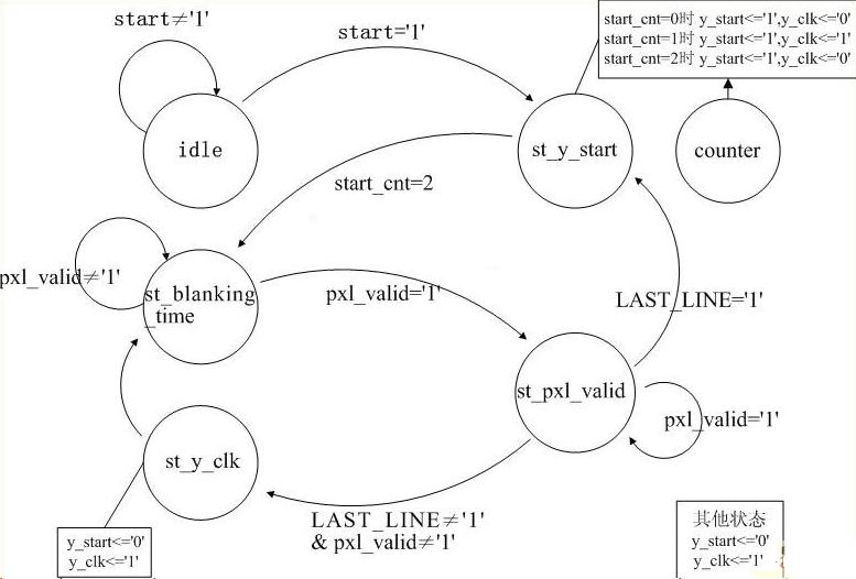 CMOS圖像傳感器結(jié)構(gòu)簡(jiǎn)單,內(nèi)部集成度高,因此僅需很少的外部控制信號(hào)即可完成視頻圖像的采集輸出。系統(tǒng)工作過(guò)程如下:當(dāng)系統(tǒng)上電后,CPLD產(chǎn)生復(fù)位信號(hào)復(fù)位整個(gè)芯片到初始狀態(tài),然后對(duì)芯片進(jìn)行并行數(shù)據(jù)注入,向CMOS圖像傳感器的特殊寄存器寫(xiě)入預(yù)定值,設(shè)置諸如像元積分時(shí)間,像素讀出行數(shù),輸出放大器增益等參數(shù)。隨后CPLD給CMOS芯片提供 ss_start信號(hào),標(biāo)志開(kāi)始像素積分,ss_stop信號(hào)結(jié)束像素積分,隨后圖像傳感器即處于可讀出狀態(tài)。向CMOS發(fā)出y_start信號(hào)開(kāi)始一幀圖像的讀出,發(fā)出y_clock信號(hào),開(kāi)始一行圖像的讀出,當(dāng)CMOS圖像傳感器有像素信號(hào)輸出時(shí), pxl_valid引腳信號(hào)為高,此時(shí)CMOS圖像傳感器正在進(jìn)行一行圖像的輸出,當(dāng)pxl_valid變低時(shí),一行圖像輸出結(jié)束,CPLD再提供下一個(gè)y_clock信號(hào),啟動(dòng)CMOS進(jìn)行下一行圖像的讀出。當(dāng)一幀圖像的最后一行開(kāi)始讀出時(shí),CMOS芯片的LAST_LINE引腳變高,標(biāo)志一幀圖像讀出的結(jié)束,CPLD再產(chǎn)生下一個(gè)ss_start信號(hào),開(kāi)始下一幀圖像的讀出。這樣,CMOS就在CPLD的時(shí)序控制下,正常工作,循環(huán)讀出圖像。