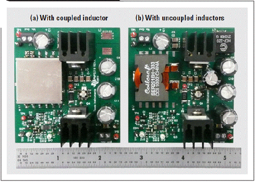 “表 1”所示規范為設計比較的基礎。第一個設計使用一個耦合電感,而第二個則使用兩個非耦合電感。