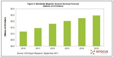 預計今年硅磁傳感器銷售額將達到14.6億美元。2010年該市場大增48.6%,達到11.8億美元。鑒于乘用車產業強勁復蘇,以及羅盤在手機和平板電腦中得到更多應用,未來幾年磁傳感器市場前景相當樂觀。