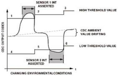 隨著環(huán)境條件的變化(例如,溫度或濕度上升),傳感器的環(huán)境參數(shù)(在用戶沒有與傳感器接觸期間,由CDC進(jìn)行測量)會(huì)發(fā)生漂移。為了進(jìn)行補(bǔ)償,需要?jiǎng)討B(tài)改變高端和低端閾值電平,以確定有效的傳感器接觸。位置2、3、5、6處的參考電平進(jìn)行重新調(diào)整,以保持最佳的閾值參考電平,從而自動(dòng)跟蹤和補(bǔ)償漂移誤差。