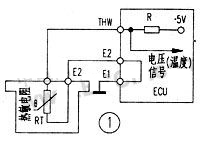 安裝好冷卻液溫度傳感器,將傳感器的連接器插好。當(dāng)點火開關(guān)置于 ON 位置時,測量圖 1 中連接器“ THW ”端子 ( 豐田車 ) 或 ECU 連接器“ THW ”端子與 E2 間輸出電壓。所測得的電壓應(yīng)與冷卻液溫度成反比變化。