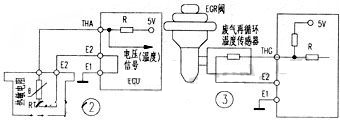 (2) 測量輸入。信號電壓。將點火開關(guān)置于 ON 位置,用萬用表的電壓擋測量圖中 ECU 的 THA 與 E2 間的電壓,該電壓值應(yīng)在 0 . 5 ~ 3 . 4V( 20 ℃ ) 范圍內(nèi)。若不在規(guī)定范圍內(nèi),則應(yīng)進(jìn)一步檢查進(jìn)氣溫度傳感器連接線路是否接觸不良或存在斷路、短路故障。 (3) 檢查進(jìn)氣溫度傳感器連接線束電阻。用數(shù)字式萬用表的電阻擋測量傳感器插頭與 ECU 插接器端子間電阻,即傳感器信號端、地線端分別與對應(yīng)的 ECU 的兩端子電阻。如果不導(dǎo)通或電阻值大于 1 Ω,說明傳感器連接線路或插頭接觸不良,應(yīng)進(jìn)一步撿查。