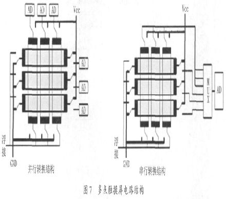于是基本電路構架便可以分為串行和并行兩種,如圖7 所示。值得注意的是,圖6 僅表現了坐標采集轉換電路的基本原理和結構,并沒有畫出為減小各種電器噪聲而添加的元件,如AD 的下拉電阻、濾波電容等。