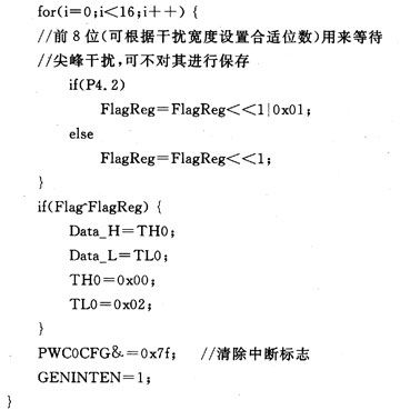 本文提出的軟件濾波算法速度快,代碼效率高,濾波效果理想,是一種實用的數(shù)字濾波設(shè)計方法,體現(xiàn)了將算法與具體硬件相結(jié)合的思想。另一方面,當(dāng)脈沖干擾較寬時可將存儲器變量適當(dāng)擴(kuò)展成多字節(jié)變量。這個算法還可以與FPGA結(jié)合,用于其他計數(shù)精度要求較高、易受尖峰脈沖干擾的應(yīng)用結(jié)合。