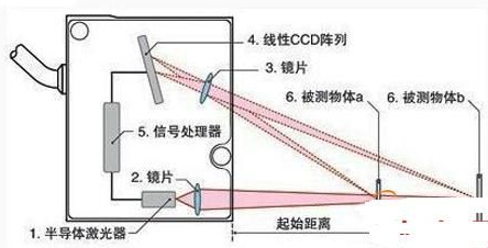 半導體激光器1被鏡片2聚焦到被測物體6。反射光被鏡片3收集,投射到CCD陣列4上;信號處理器5通過三角函數計算陣列4上的光點位置得到距物體的距離。