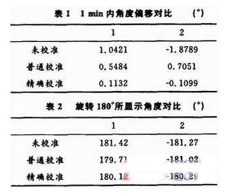 ADIS16365擁有較為完善的數(shù)據(jù)處理方案,經(jīng)測(cè)試,使用其內(nèi)部校正功能可以明顯改善系統(tǒng)性能。根據(jù)寫入GLOB_CMD寄存器命令的不同,可以采用不同的處理方法。表1和表2列出了內(nèi)部普通校準(zhǔn)和精確校準(zhǔn)與未校準(zhǔn)數(shù)據(jù)的比較。
