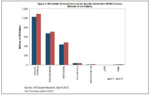 據(jù)IHS iSuppli公司的MEMS市場簡報,各國政府要求采用汽車安全傳感器的法規(guī),2012年仍將是推動全球MEMS產(chǎn)業(yè)增長的重要因素,幫助汽車MEMS營業(yè)收入實現(xiàn)7%的健康增長。