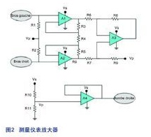 這個測量儀表放大器包含有兩個級。最后一個級(亦即輸出級)是一個差分放大器,它能夠拒絕直流電平以及同時影響兩個輸入的干擾和噪聲電壓源。由兩個放大器組成的第一級(亦即是輸入級)則被配置成一個可將輸入隔離的緩沖器。可是,基于放大器間的失配使它們彼此不能相互連接,所以要在兩個放大器之間加裝平衡電阻。將兩個級的增益相乘便可得出測量儀表放大器的增益。理論上,共模抑制比(CMPR)應(yīng)該是無限大,但由于出現(xiàn)電阻失配,導(dǎo)致輸出級的非零共模增益非常小。在電路的輸入級中,流經(jīng)所有電阻的電流是一樣的。這都有賴于LMP2234具有高輸入阻抗和低輸入偏置電流的特點(diǎn)。