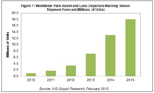 據IHS汽車研究報告,幫助汽車自動行駛的汽車傳感器市場目前已經出現,而且未來幾年將保持高速增長。自動駕駛應用中的傳感器含泊車輔助攝像頭與車道偏離警告攝像頭等。這類傳感器2012年出貨量預計將達340萬個,是去年170萬個的兩倍,到2015年將達到1800萬個左右,幾乎是2010年939200個的20倍……