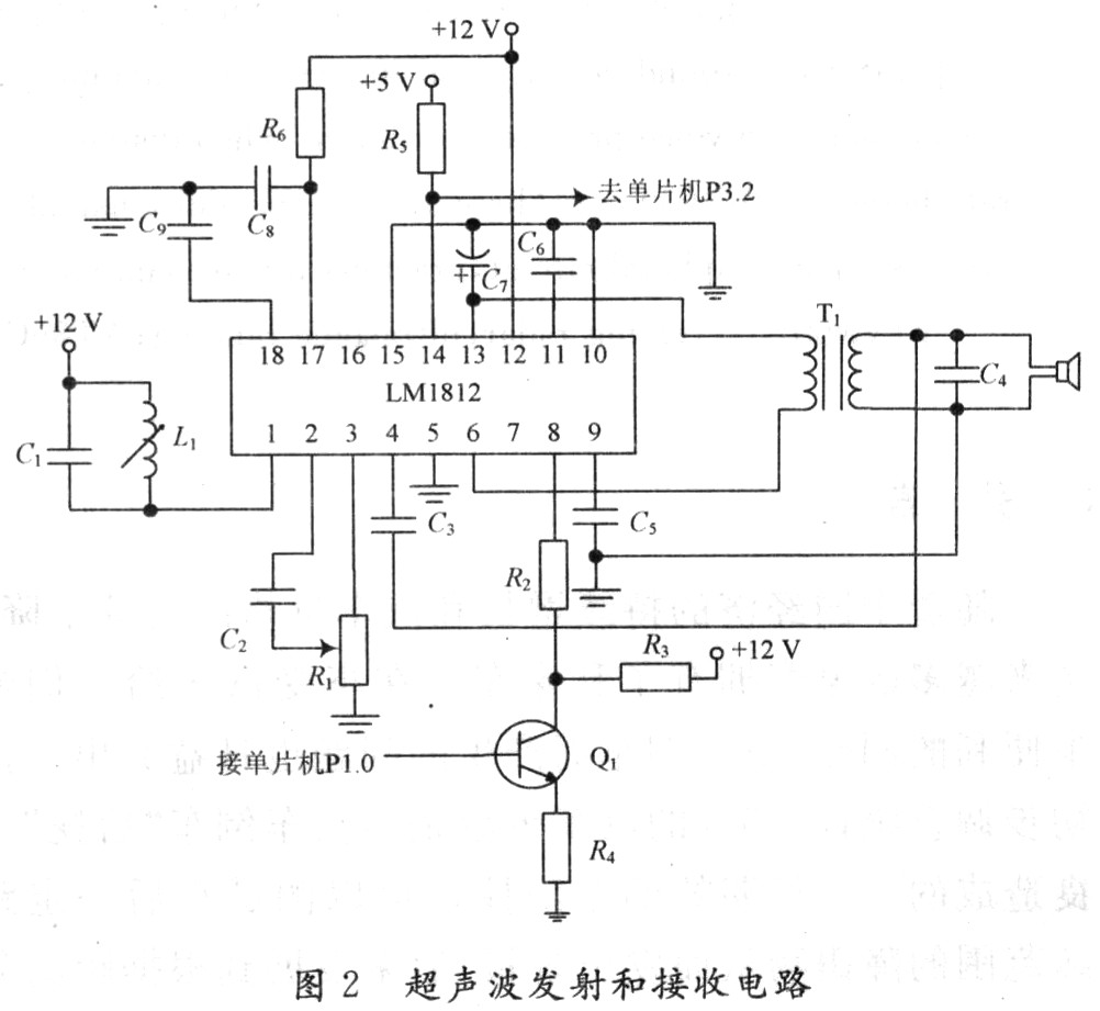 超聲波發射和接收電路如圖2所示。當LM1812的8腳為高電平時,LM1812處于發射模式;當8腳為低電平時,LM1812處于接收模式。值得注意的是,單片機到LM1812的連接要進行5~12 V的電平轉換。當LM1812處于發射模式時,L1,C1振蕩槽路被切換為振蕩模式,振蕩信號經驅動放大后,由13腳及6腳輸出。6,13腳之間所接變壓器線圈的匝數比是根據TCF40-25TR1型收發一體式超聲波傳感器的阻抗來確定的。實驗證明,變壓器線圈的匝數比大約為4:1時可實現與超聲波發送器阻抗相匹配。超聲波接收器接收到的超聲波信號經電容耦合由4腳輸入,再經內部兩級放大后同由1腳的諧振回路取出的信號一起送到檢測器。當檢測到超聲波回波信號時,LM1812的14腳(與單片機的INT0端相連)變為低電平,使單片機的T0計數器停止計數。