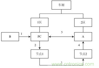 系統(tǒng)設(shè)計(jì)方案非常簡(jiǎn)單。一般來(lái)講火車車廂全長(zhǎng)26.6 m ,而無(wú)線傳感器網(wǎng)絡(luò)(wireless sensor net2works ,WSN)的通信距離在幾十米到幾百米之間,一般為30 m ,因此一個(gè)節(jié)點(diǎn)就可以完全覆蓋整個(gè)車廂。在系統(tǒng)中只有2個(gè)節(jié)點(diǎn)(不需PC協(xié)助) :節(jié)點(diǎn)1作為發(fā)信者,節(jié)點(diǎn)2作為收信者,組成最簡(jiǎn)單的網(wǎng)絡(luò),不需跳轉(zhuǎn)。系統(tǒng)的結(jié)構(gòu)簡(jiǎn)單,使得傳輸時(shí)延非常小,比較適合應(yīng)用在上文中提到的場(chǎng)合。