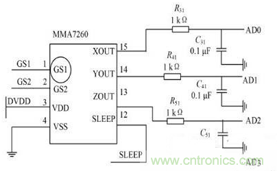 本無(wú)線采集系統(tǒng)采用了Freescale 公司最新推出的一款低成本、單芯片、三軸加速度傳感器MMA7260.該微型電容式加速傳感器融合了信號(hào)調(diào)理、單極低通濾波器和溫度補(bǔ)償技術(shù),提供了4 種加速度測(cè)量范圍,分別為±1.5 g , ±2 g , ±4 g 和±6 g.考慮到前文將閾值定為0.2 g ,故設(shè)置參數(shù)將測(cè)量范圍定為±1.5 g.在CC1010 與MMA7260 的接口中,首先要考慮噪聲問(wèn)題。因?yàn)镸MA7260 內(nèi)部采用了開(kāi)關(guān)電容濾波器, 有時(shí)鐘噪聲產(chǎn)生, 所以需要在MMA7260 的XOU T ,YOU T 和ZOU T 三個(gè)輸出端分別接RC 濾波器;其次要考慮電壓匹配問(wèn)題,由于x , y , z 軸方向的電壓輸出是0.45~2.85 V ,CC1010 的ADC 最大輸入范圍是0~V DD .此處,V DD = 3.3 V ,其范圍恰好在ADC的輸入范圍之內(nèi), 所以不用考慮額外的分壓電阻。CC1010 和MMA7260 的接口電路如圖3 所示。R31 / C31 , R41 / C41 , R51 / C51 用于濾除MMA7260 內(nèi)部采樣的開(kāi)關(guān)噪聲,GS1 ,GS2 用于量程選擇。