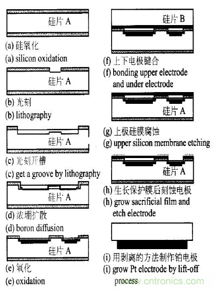 硅電容式壓力傳感器的敏感元件是半導體薄膜,它可以由單晶硅、多晶硅等利用半導體工藝制作而成。典型的電容式傳感器由上下電極、絕緣體和襯底構成。當薄膜受壓力作用時,薄膜會發生一定的變形,因此,上下電極之間的距離發生一定的變化,從而使電容發生變化。但電容式壓力傳感器的電容與上下電極之間的距離的關系是非線性關系,因此,要用具有補償功能的測量電路對輸出電容進行非線性補償。由于高溫壓力傳感器工作在高溫環境下,補償電路會受到環境溫度的影響,從而產生較大的誤差?;谀P妥R別的高溫壓力傳感器,正是為了避免補償電路在高溫環境下工作產生較大誤差而設計的,其設計方案是把傳感器件與放大電路分離,通過模型識別來得到所測環境的壓力。高溫工作區溫度可達350 ℃。傳感器件由鉑電阻和電容式壓力傳感器構成。其MEMS 工藝如下: