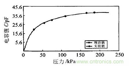 表1 可見,擬合的電容誤差小于1 %。由此可見,在不同的時刻測得UO ( t) ,通過曲線擬合得出參數RC。再給電路加小信號直流電源,測出R 值,即求得C ,通過C 值則可知被測環境的壓力。圖5為350 ℃時,不同的壓力對應的電容的理論值和實驗值,從實驗數據(表2) 可得,在測壓的過程中,利用模型識別的方法,誤差較小,其測壓誤差小于2 %。