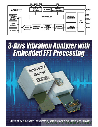 在一些應(yīng)用案例中,相對(duì)簡(jiǎn)單的傳感器輸出可能就足夠了,但在另一些應(yīng)用中(例如,通過震動(dòng)分析進(jìn)行狀態(tài)監(jiān)控),則需要增加相當(dāng)多的處理過程才能實(shí)現(xiàn)所需的輸出。圍繞慣性傳感器而構(gòu)建的一個(gè)高集成度器件示例是ADIS16227(見圖2),它是一款完全自治的頻域震動(dòng)監(jiān)控器。此類器件可能不提供相對(duì)簡(jiǎn)單的g/mV輸出,而是提供特定應(yīng)用分析。在本例中,其嵌入式頻域處理、512點(diǎn)實(shí)值FFT和片上存儲(chǔ)器能夠識(shí)別各震動(dòng)源并進(jìn)行歸類,監(jiān)控其隨時(shí)間的變化情況,并根據(jù)可編程的閾值做出反應(yīng)。