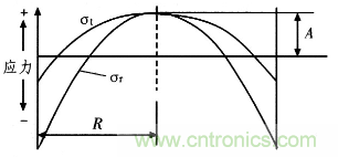 同樣,當r=0.812R時,σT=0,且σr<0,如圖3所示。在圓形硅膜片上,沿[110]晶向,在0.635R半徑內外各擴散2個電阻,并適當安排擴散的位置,使得σn=一σro,則有(△R/R)i=一(△R/R)