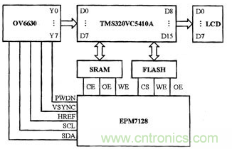 系統中的核心處理芯片選用TI公司的加強型定點DSP芯片TMS320VC5410A,該DSP的工作頻率可達160 MHz,內部有64KBRAM空間可以靈活的映射為數據或程序存儲空間。由于DSP的內部存儲空間有限,所以,本設計在外部擴展了一大小為1 MB的SRAM數據存儲器CY7C1021和256 K的FLASH程序存儲器SST39VF400A??刂菩酒珻PLD選用Altera公司的MAX7000系列芯片EPM7128SLC84-15。該芯片包含84個I/O管腳、128個宏單元,每16個宏單元可組成一個邏輯陣列塊,工作電壓為5.0 V。該芯片在系統中處于總體時序控制地位,既用于給圖像傳感器芯片提供控制信號。也用于SRAM和FLASH的片選和讀寫控制,同時還負責LCD的顯示控制。