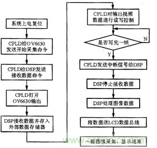 由于圖像像素點的個數已知,即數據個數已知,故在計數完畢后,CPLD將發出計數完畢信號。而DSP在接收到中止信號后,即可開始讀取RAM中的數據,并對數據進行壓縮和相應的處理,然后把數據放到LCD液晶屏的數據總線,最后將采集到的圖像在液晶屏上顯示出來。圖3為圖像采集系統的軟件流程圖。