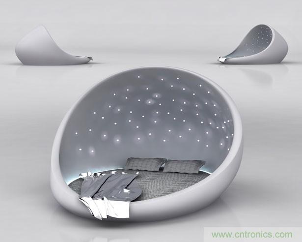 The Cosmos Bed由白色玻璃纖維制成,形狀酷似雞蛋和太空艙,內置床墊可根據需要調節傾斜度。其特別之處在于,采用了柔和的LED照明系統模擬星光效果,配合寧靜的音樂及戶外特有的氣味,讓你在舒適放松的感覺下進入甜美夢鄉。The Cosmos Bed還自帶鬧鈴設備,就算到了該起床的時間,也不用擔心睡過頭。