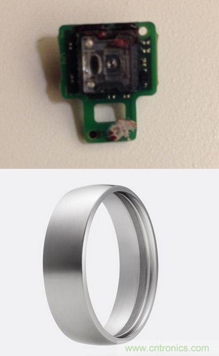 用戶可以旋轉(zhuǎn)Nest恒溫器的外圈來選擇選項(xiàng)。這個光電鼠標(biāo)上的發(fā)射器/傳感器組合就是用來檢測旋轉(zhuǎn)的器件。外圈內(nèi)部可以看到光學(xué)鼠標(biāo)元件用來檢測旋轉(zhuǎn)的溝槽圖案。