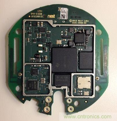 移除Nest恒溫器主板的金屬屏蔽罩后,可以看到一個德州儀器(TI)Sitara CPU、電源管理和USB芯片、閃存、32Mx16 SDRAM及一個村田(Murata)Wi-Fi模塊。此外,還有一個ZigBee網(wǎng)絡(luò)協(xié)處理器,表明該器件將來可以進(jìn)行擴(kuò)展。