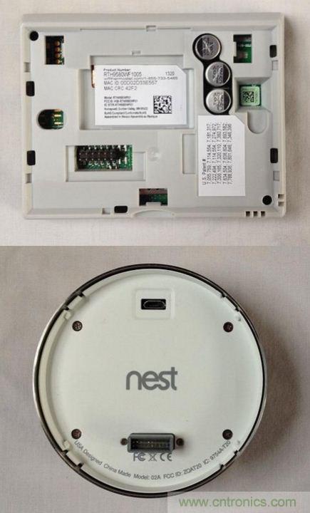 霍尼韋爾恒溫器的單個PCB上包括多個DC-DC轉(zhuǎn)換器、穩(wěn)壓器和整流器、一個8通道12位ADC、128MB SDRAM、32M閃存和博通(Broadcom)Wi-Fi模塊(屏蔽罩移除)。主處理器是愛特梅爾(Atmel)926 ARM處理器,外面包覆了金屬屏蔽罩,僅在扁平帶狀電纜至顯示器下方可見。Nest恒溫器的主要電子元器件全部被包覆在單個屏蔽罩下。靠近底部的兩個附加電路提供檢測功能。PCB與顯示器通過螺絲固定,金屬環(huán)被卡在兩者之間,但可以自由旋轉(zhuǎn)。