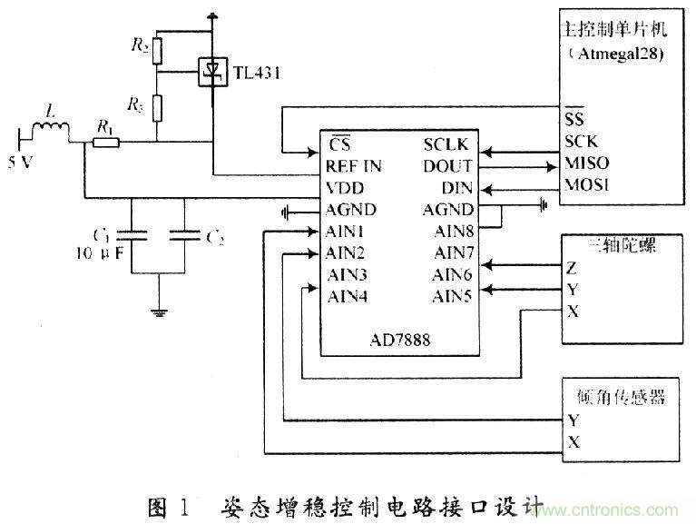 無人機(jī)內(nèi)回路控制作為外回路控制的基礎(chǔ),對其能否穩(wěn)定飛行起著至關(guān)重要的作用。該系統(tǒng)中,內(nèi)回路是由三軸陀螺和傾角傳感器構(gòu)成的姿態(tài)增穩(wěn)控制回路。主要由主控制單片機(jī)、A/D采樣芯片、三軸陀螺儀和傾角傳感器組成。主控制單片機(jī)通過SPI串行總線與A/D采樣芯片相連,通過A/D采樣芯片獲得三軸陀螺儀的角速率與傾角傳感器的橫滾角和俯仰角,然后進(jìn)行姿態(tài)信息融合,得到無人機(jī)俯仰和橫滾的姿態(tài)信息。主要接口連接情況如圖1所示。