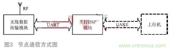在傳感器網(wǎng)絡中,采用ZigBee通信協(xié)議時,節(jié)點被分為Coordinator、Router以及End Device三種。Coordinator負責系統(tǒng)的初始化工作,選擇網(wǎng)絡的信道等參數(shù)建立網(wǎng)絡,供其他節(jié)點加入;Router負責節(jié)點之間命令消息的路由轉發(fā)實現(xiàn);End Device負責任務是消息的發(fā)送和接收,只能和父節(jié)點進行數(shù)據(jù)通信,不具有路由轉發(fā)的功能。在本系統(tǒng)中,Sink節(jié)點主要負責監(jiān)控網(wǎng)絡的建立、上位機命令的分析處理和操作、數(shù)據(jù)的收集等任務,是整個網(wǎng)絡的數(shù)據(jù)存儲和處理中心,在上位機和監(jiān)控網(wǎng)絡之間起到橋梁的作用,是系統(tǒng)應用中的Coordinator。監(jiān)控網(wǎng)絡區(qū)域內的待定位節(jié)點要具備消息轉發(fā)與路由其他節(jié)點的能力,需要可以給所有節(jié)點發(fā)送消息,也可以接收到所有節(jié)點的消息,是系統(tǒng)應用中的Router。每個節(jié)點由無線數(shù)據(jù)傳輸模塊和主控DSP模塊組成,同一節(jié)點的兩個模塊之間通過UART總線進行通信。節(jié)點之間通過無線RF射頻方式進行通信。Sink節(jié)點與上位機使用UART總線進行通信,未知節(jié)點的通信方式中并不包含該通信方式。節(jié)點的通信方式如圖3所示。