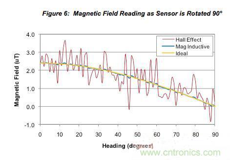 下圖顯示了地磁傳感器在磁場強度為2.4mT數量級的固定位置旋轉時輸出的磁場讀數。在圖5中,傳感器旋轉了整整360°,而在圖6中,傳感器從0°旋轉到90°。這兩張圖都繪出了霍爾效應傳感器、永磁感應傳感器和理想傳感器的試驗數據。