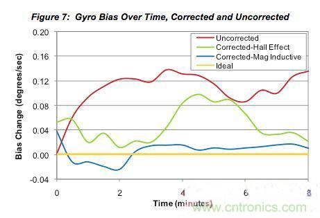 前面的圖3給出了隨時間變化的陀螺儀零偏,它代表了長期航向漂移的根本原因。在9軸傳感器融合系統中,加速度計和磁力傳感器建立了一個長期的基準用于校正零偏變化。但磁力傳感器讀數中的噪聲以及磁力傳感器類型對零偏校正的效果有顯著的影響。圖7再次顯示了隨時間改變的零偏變化,但這次畫出了未校正的、用霍爾效應傳感器校正的、用永磁感應傳感器校正的和理想輸出的圖形。值得注意的是,所用的傳感器融合算法對兩種傳感器來說是相同的。