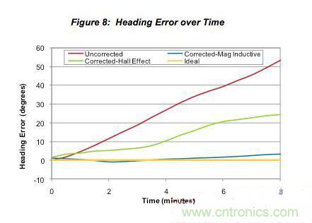 永磁感應傳感器可以更好地控制零偏漂移的能力將顯著改善隨時間變化的航向性能,如圖8所示。我們在這里可以看到,與未校正系統相比,使用霍爾效應傳感器的傳感器融合系統的長期性能在8分鐘內減少航向誤差的效果高出2倍。但使用永磁感應傳感器的傳感器融合系統與未校正系統相比可以減少航向誤差一個數量級,比基于霍爾效應磁力傳感器的系統好5倍。