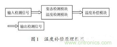 傳感器根據輸入的檢測信號,通過姿態檢測模塊和溫度檢測模塊采集相關數據,然后經過溫度補償模塊進行相應的溫度補償,最后通過輸出檢測模塊可得到預期的檢測信號。姿態傳感器的溫度補償原理如框圖1所示。