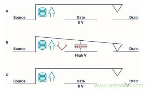 請(qǐng)注意,即便是在開(kāi)啟位置上,開(kāi)關(guān)梁仍然會(huì)有將開(kāi)關(guān)往上拉動(dòng)的彈簧力(藍(lán)色箭頭),但是只要向下拉動(dòng)的靜電力量比較大,那么開(kāi)關(guān)就會(huì)維持在開(kāi)啟的狀態(tài)。 最后,當(dāng)閘極電壓被移除時(shí)(圖一中的C狀況),也就是在閘極電極上0 V,靜電吸引力也會(huì)跟著消失,而開(kāi)關(guān)梁會(huì)以具有足夠回復(fù)力(藍(lán)色箭頭)的彈簧而動(dòng)作,開(kāi)啟源極與汲極之間的鏈接,然后回返至原本的關(guān)閉位置。