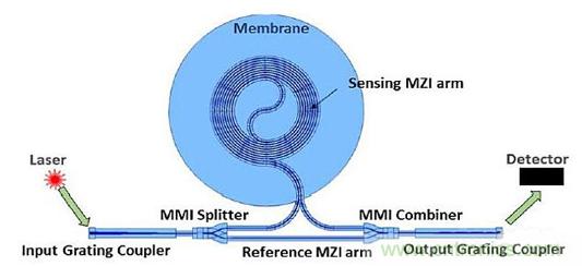 在功能上,從MZI發(fā)出的光強取決于兩個臂之間的相位差及其所承受的差壓。由于其中一個臂比另一個長得多,MZI是“不平衡的”。