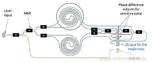 改進后的MOM壓力傳感器設(shè)計,MZI是平衡的;第一個是大范圍測量用單回路,第二個將敏感螺旋臂中的信號分成兩路去相位輸出,這樣就能始終對每一壓力進行靈敏測量(圖3)。