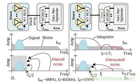 神經(jīng)探針的信號帶寬約為7.5kHz,可以采用15kHz對PA輸出采樣。設(shè)計人員發(fā)現(xiàn)可以將時分復(fù)用技術(shù)嵌入柄中(圖4a)。這樣做可以使每個獨特的柄線上有M個PA輸出。如果沒有加抗混疊濾波器進行限制,則PA帶寬會由于折疊而產(chǎn)生帶內(nèi)噪聲。在采樣發(fā)生之前,將低通濾波器裝入這個小PA區(qū)域是不可能的。設(shè)計人員選擇使用能夠在Ti時間段對信號進行積分的架構(gòu)(圖4b)來衰減超出采樣頻率fi的信號,從而提高信噪比(SNR)。