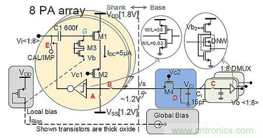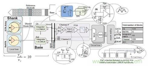 探針架構(gòu)設(shè)計(圖5)中的信號流,通過一條共享柄線從8個多路復(fù)用PA陣列的輸出流向底座。然后,該信號進入探針底座中的積分器,積分器的輸出通過8個標記為Vo的采樣保持電路進行解復(fù)用。接下來,8個單獨的Vo中的每一個都進入自己的信道模塊,它們對信號進行放大和濾波,使得輸出僅有感興趣的頻帶。接下來,所有20個通道經(jīng)過多路復(fù)用并由10位逐次逼近寄存器式(SAR)模數(shù)轉(zhuǎn)換器(ADC)進行數(shù)字化,并發(fā)送至為ADC和多路復(fù)用/多路解復(fù)用器(MUX/DEMUX)提供時鐘的數(shù)字控制模塊。在此,所有ADC的并行輸出經(jīng)串行化后僅有6條數(shù)據(jù)線。