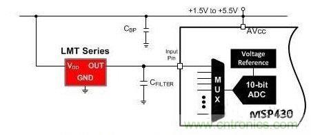 模擬溫度傳感器是一個有源半導體器件,它的輸出是與溫度成比例的電壓值或電流值。作為一個集成電路 (IC),模擬溫度傳感器具有熱敏電阻所不具備的內置智能性,從而使與模擬溫度傳感器有關的設計工作變得簡單。圖3顯示了其中一款TI LMT系列模擬溫度傳感器的典型應用,在這個應用中,只有IC,而未使用外部組件。