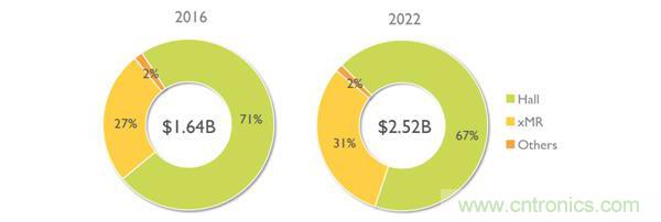 2016年和2022年按技術(shù)分類(lèi)的磁傳感器市場(chǎng)份額