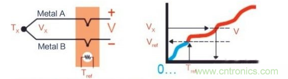 熱電偶是溫度測量中最常用的傳感器。其主要好處是寬溫度范圍和適應各種大氣環境,而且結實、價低,無需供電,尤其最便宜。熱電偶由在一端連接的兩條不同金屬線(金屬A和金屬B)構成,如圖1所示。當熱電偶一端受熱時,熱電偶電路中就有電勢差。可用測量的電勢差來計算溫度。