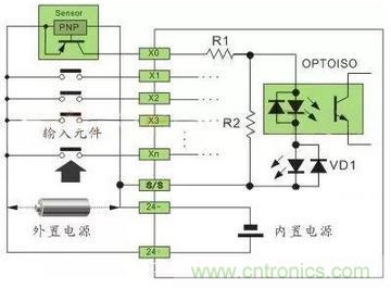 PLC 的數字量輸入接口并不復雜,PLC 為了提高抗干擾能力,輸入接口都采用光電耦合器來隔離輸入信號與內部處理電路的傳輸。因此,輸入端的信號只是驅動光電耦合器的內部 LED 導通,被光電耦合器的光電管接收,即可使外部輸入信號可靠傳輸。