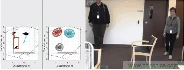 圖4:使用毫米波傳感器執(zhí)行分類的范例:中間圖上所有移動目標都分配了一個軌道,其中的每個彩色區(qū)域代表一個人