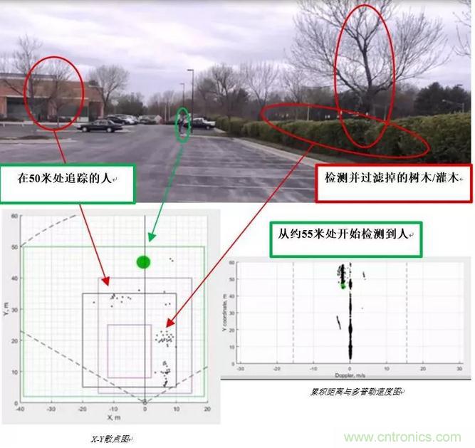 圖2顯示了使用毫米波技術(shù)的入侵檢測(cè);毫米波傳感器分析場(chǎng)景中對(duì)象的速度,過濾掉移動(dòng)背景中的運(yùn)動(dòng),僅跟蹤人物。
